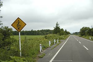 さて、昨夜確認しておいた知床メロディロードはこの伊茶仁川の近くである。ト音記号の警戒標識などあっていいのだろうかと首を傾げながら、撮影する。